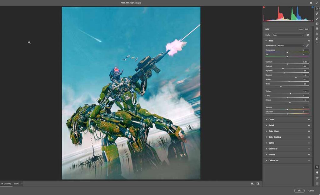 Inside the camera raw filter, you can start off w/ presets and then dial in your look from there or just got straight to the manual tweaking. The Basic section has some great fine-tuning features including texture, clarity, and de-hazing, plus segmented exposure control. Curve, Detail, Color Mixer, Color Grading, Optics, Geometry Effects and Calibration are the rest of the sections. Each one dives deep into various photoshop functions and lets you get really granular. I use sharpening in Detail, get a look w/ Color Grading and sometimes Color Mixer, Add slight distortion in Optics (usually -1), and Grain and Vignetting in Effects. You can also use the adjustment brush to paint in a range of adjustments to get the frame exactly how you want it to look.